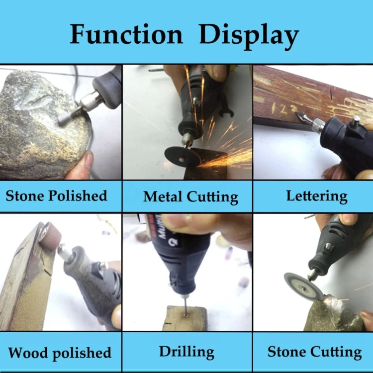 1. Rotating speed: 5000-18000PRM. 2. DC 18V charging input. 3. Copper collet: 0.5-3.0mm. 4. Professional and practical, compact and portable. 5. Widely used in mobile phones, toys, small electronic products servicing. 6. Suitable for rough grinding, grinding and polishing of various metals and non-metals