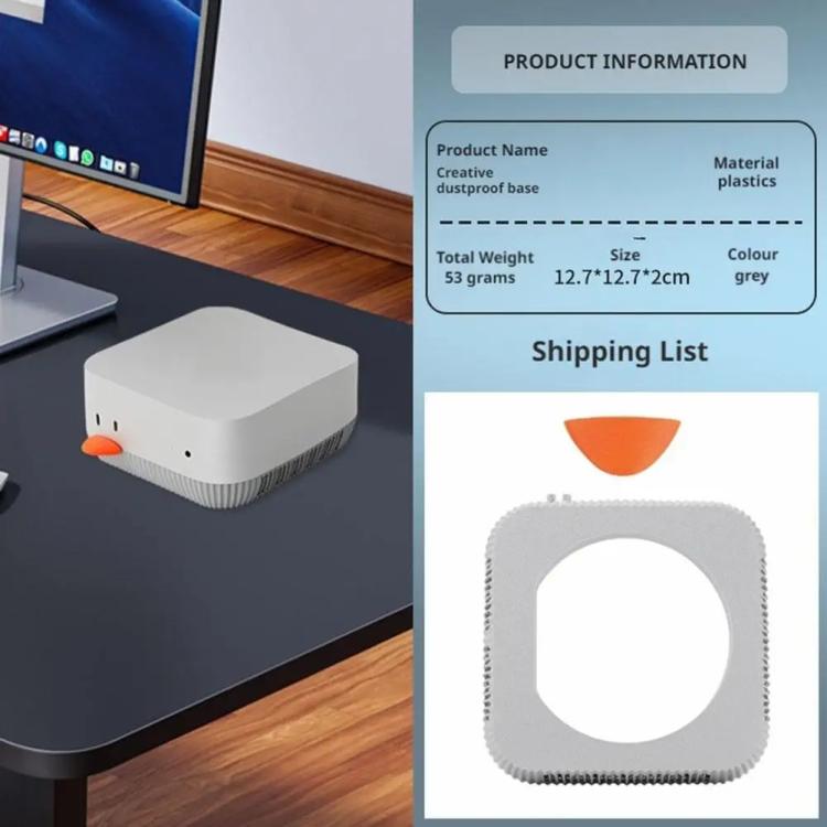 中文描述: 1. Creative dustproof and heat dissipation base for Mac mini m4 Creative shape real machine mold, dustproof and heat dissipation 2. Cute pet button, one-click power on Carefully designed external button power on, for Macmini m4-just press to power on 3. Effective dustproof and heat dissipation The dust filter installed on the air inlet can effectively prevent dust, hair and other debris from entering The for Mac mini m4 air outlet is hollowed out to enhance air circulation and dustproof and heat dissipation. 4. Washable filter The built-in filter can be removed and reused after cleaning 5.Color: black/gray 6.Material: plastic 7.Single set weight: 80g 8.Packing method: boxed Single set contains: base bracket*1