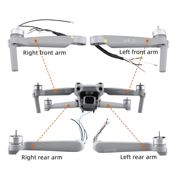 1. Main material: metal, plastic 2. Made of high quality material, reliable and durable 3. Maintenance parts, used for accidental damage replacement, more worry-free maintenance 4. Long service life and easy installation 5. Main material: metal, plastic 6. For Mavic Air 2S 7. Net weight: 38.5 grams (left forearm), 38 grams (right forearm), 31.8 grams (left rear arm), 31.5 grams (right rear arm) 8. Product size: 11.5x4.9x1.5 cm (lower shell), 12.7x7.5x2.2 cm (forearm), 12x4x2.2 cm (back arm)